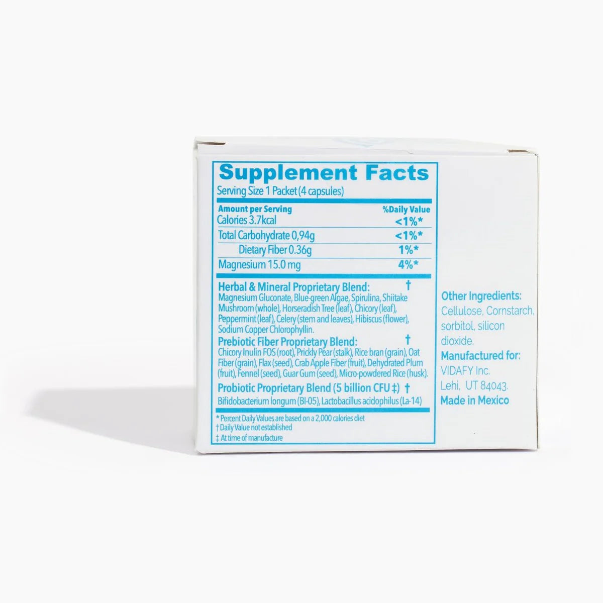 Recomendado para el consumo de mayores de 12 años. No exceda la ingesta recomendada. Se sugiere beber al menos 1/2 galón de agua por día cuando se toma SYNBIOFY.